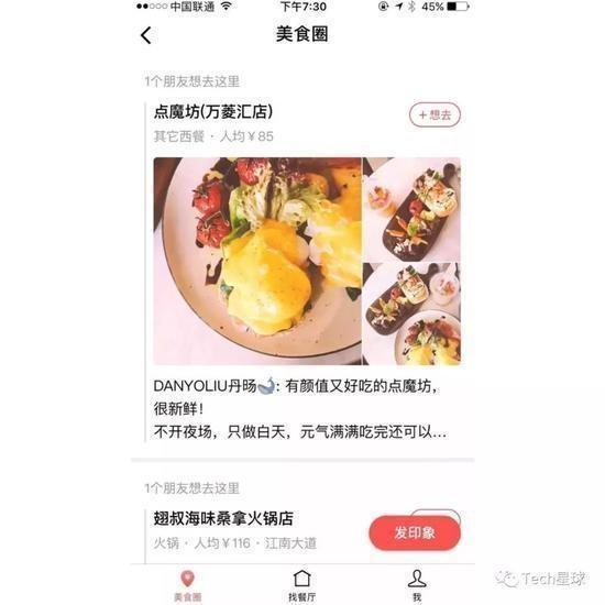 这是一个去社交化的广场,系统会显示附近的约100家餐厅,网红或者受欢迎程度高的餐厅则会在下方予以推荐。