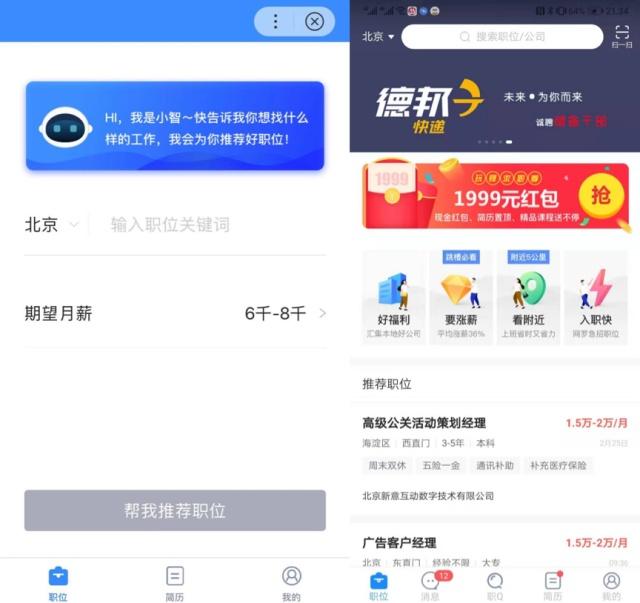 (智联招聘智能小程序首页推出模糊匹配功能、App首页面展示丰富功能)
